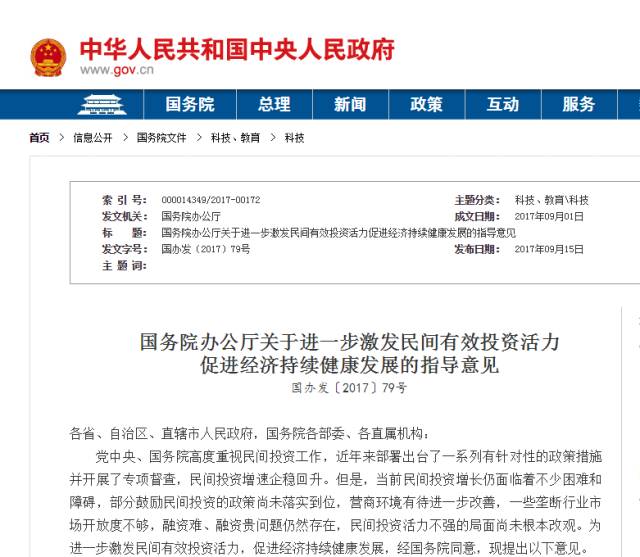 党中央、国务院高度重视民间投资工作,近年来部署出台了一系列有针对性的政策措施并开展了专项督查,民间投资增速企稳回升。但是,当前民间投资增长仍面临着不少困难和障碍,部分鼓励民间投资的政策尚未落实到位,营商环境有待进一步改善,一些垄断行业市场开放度不够,融资难、融资贵问题仍然存在,民间投资活力不强的局面尚未根本改观。为进一步激发民间有效投资活力,促进经济持续健康发展,经国务院同意,现提出以下意见。